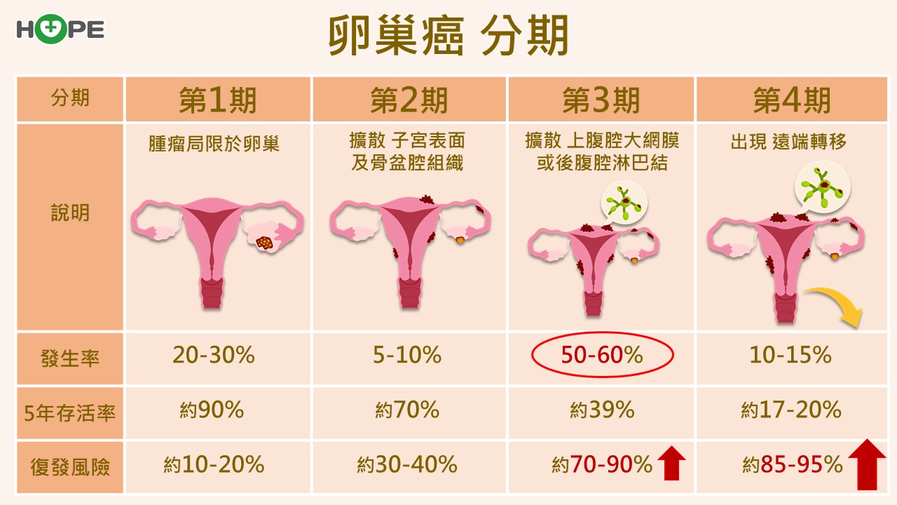 卵巢癌的分期依癌細胞擴散範圍而定。第三期代表癌細胞已擴散到上腹腔大網膜或淋巴結,第四期則表示出現遠端轉移。隨著期別上升,存活率明顯下降:第三期五年存活率不到四成,第四期更低於兩成。