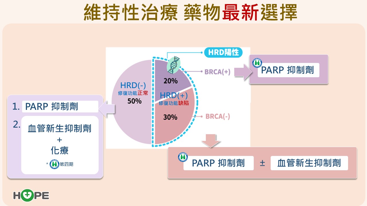 這項發現讓更多病人有治療希望。目前政府已擴大給付範圍,HRD陽性病人可單用PARP抑制劑或 再加上血管新生抑制劑,不僅顯著提升治療效果,也減輕經濟負擔。