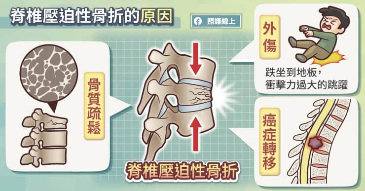 另外一個常見的壓迫性骨折原因是外傷,除了車禍、墜樓這種明顯的外傷事件之外,一些日常意外也很常見,像是突然跌坐到地板,衝擊力過大的跳躍,也都可能帶來壓迫性骨折。