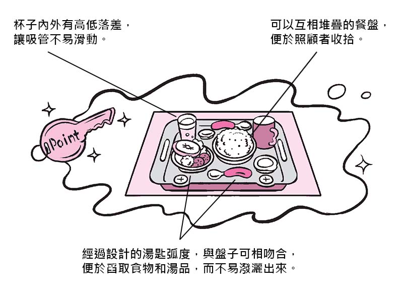 經過設計的湯匙弧度,盤子可相吻合,便於舀取食物和湯品,而不易潑灑出來。可以互相堆疊的餐盤,便於照顧者收拾。杯子內外有高低落差,讓吸管不易滑動。