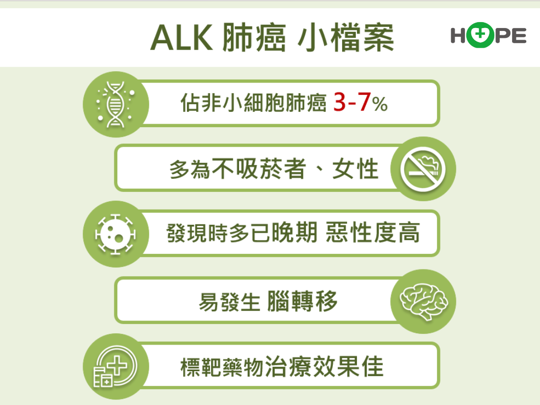 在肺腺癌中約3%至7%的病人帶有ALK基因突變,這群病人在發現時大多都已屬晚期,且腫瘤惡性度偏高。不過,幸運的是,目前ALK標靶藥物已發展至第三代,被形容「藥比病人還多」,且治療效果非常好。醫師建議,應將最有效的標靶藥物做為第一線治療,以期病人獲得最佳、最長的無疾病惡化存活期,不必擔心「留到後面沒藥可用」。
