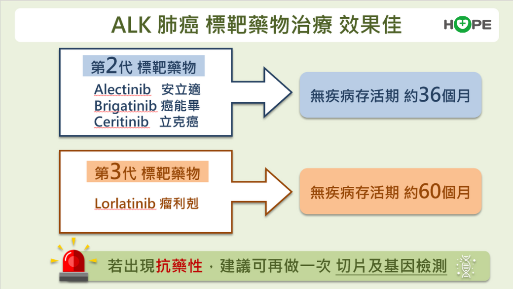 目前的標靶藥是有效就一直吃的策略,當藥物最終產生抗藥性無效時,會建議病人再次穿刺取樣,進行完整的次世代基因檢測(NGS),以確認抗藥機制或細胞型態是否轉變,進而規劃下一步的合併治療 。對ALK病人來說,有機會與標靶藥物「長期共存」。