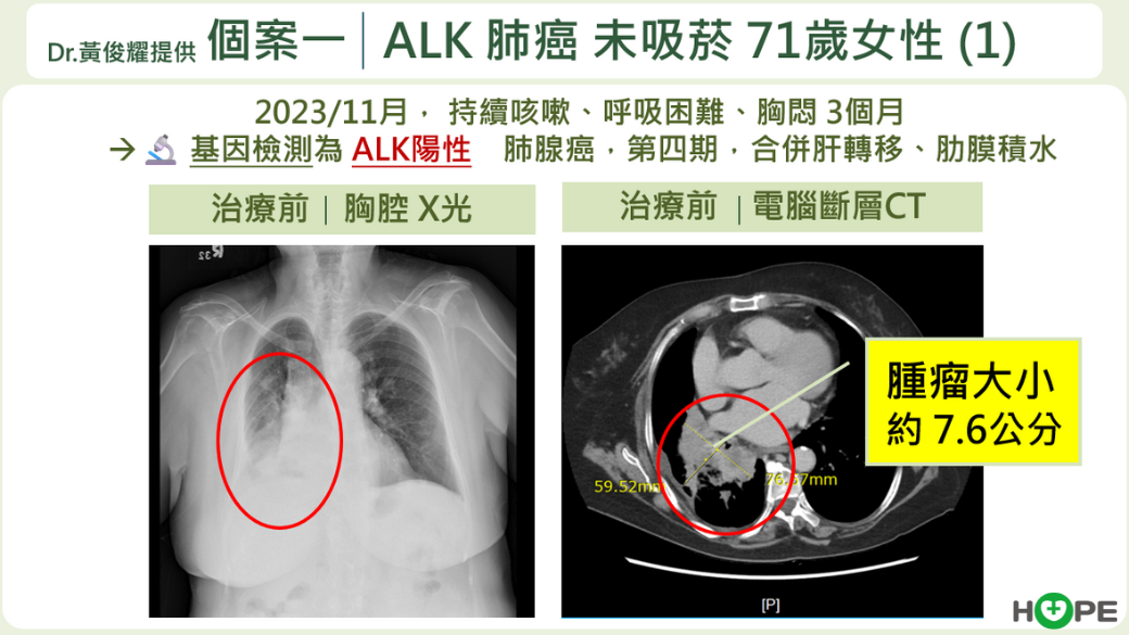 標靶藥物對ALK病人的療效顯著。黃俊耀醫師分享,有一名71歲女性,因心衰竭症狀求診,結果發現肺已有近8公分的腫瘤,是第四期肺癌,並轉移到肝臟且有肋膜積水。