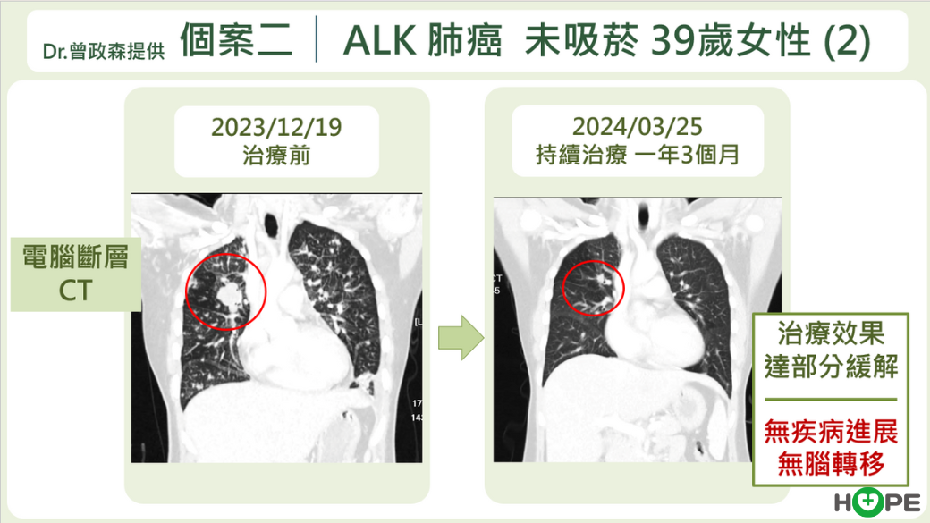 在確診為ALK陽性並接受標靶治療後,她的血氧濃度很快回升,連躺平困難的症狀也獲得迅速改善,腫瘤明顯縮小,治療效果很好。