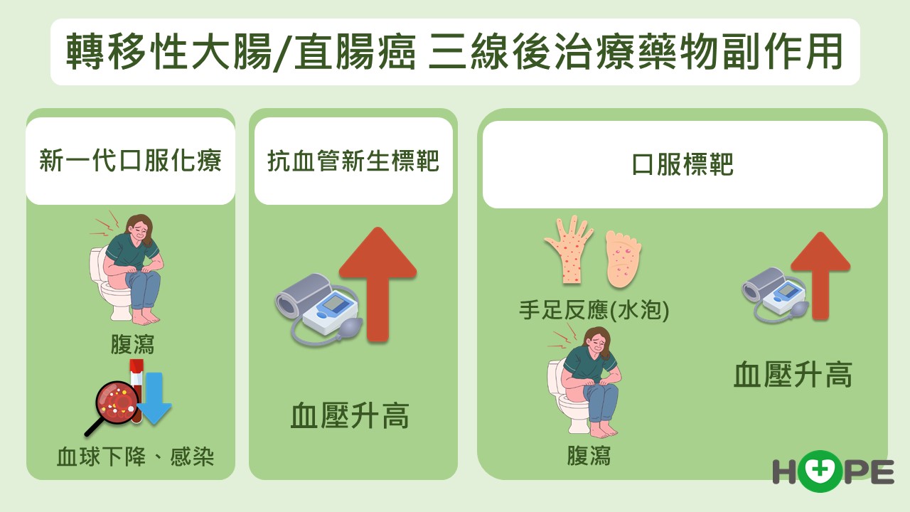 無論是化療或標靶藥都有副作用,新一代口服化療藥物有血球下降、抵抗力低下、腹瀉等。標靶藥物中常見手掌跟腳掌起水泡、腹瀉、疲憊等;但全新的標靶副作用較為輕微,會有血壓上升。而這些副作用絕大多數都能妥善處理。