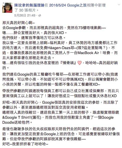 Google除了安排專人為玟聿和她的家人進行總部的導覽外,Google的總經理簡立峰先生和相關部會主管更是特別抽空出來,想和這位Google的小小愛用者和可能是未來的員工,進行面對面的對談。