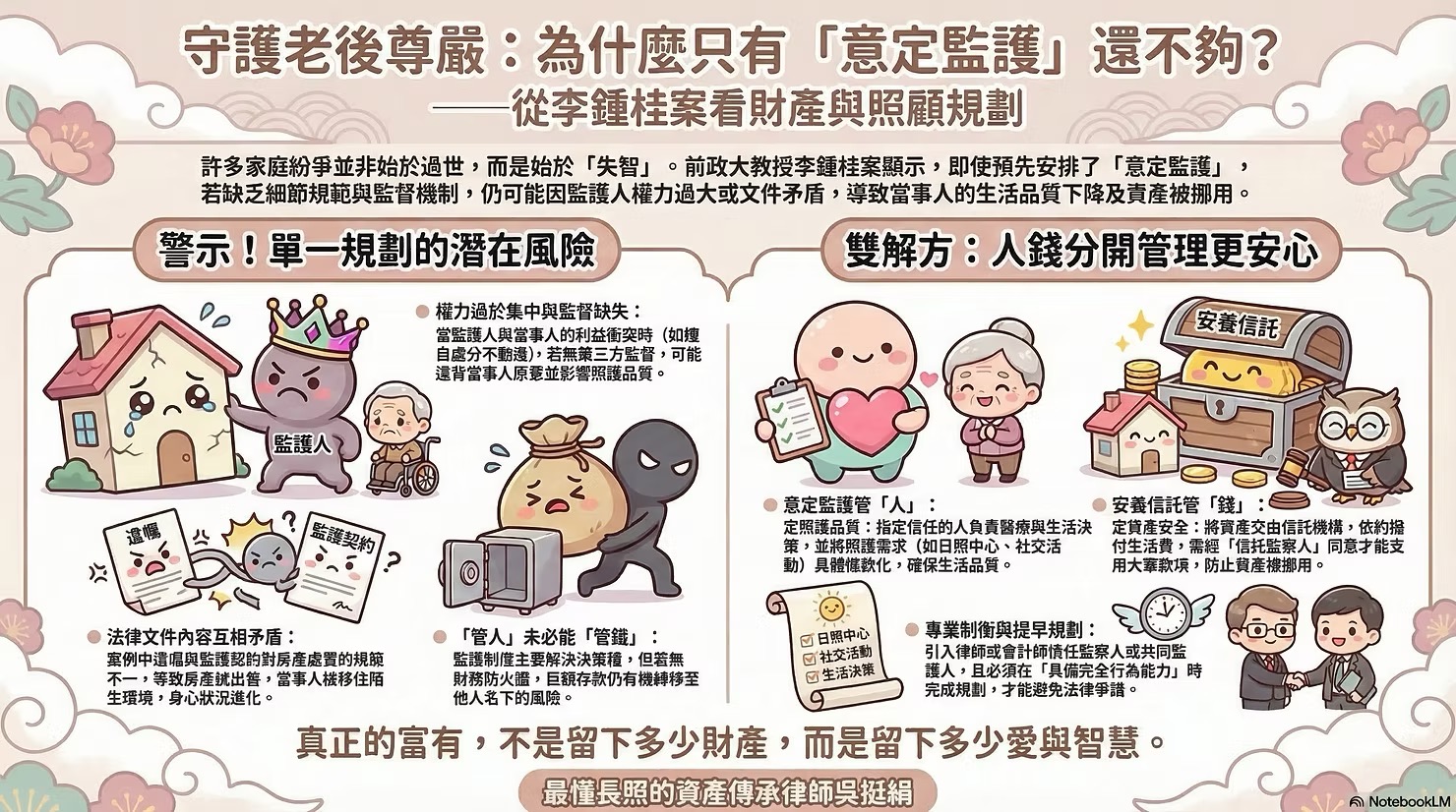李鍾桂案提醒我們,法律工具若未經專業的客製化整合,仍可能成為他人的奪權利刃。唯有提早準備,才能將資產轉化為守護晚年的護城河。