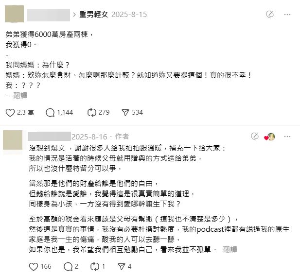 ▲Threads上有真實案例,媽媽只分產給兒子,沒有給女兒。 圖/Threads