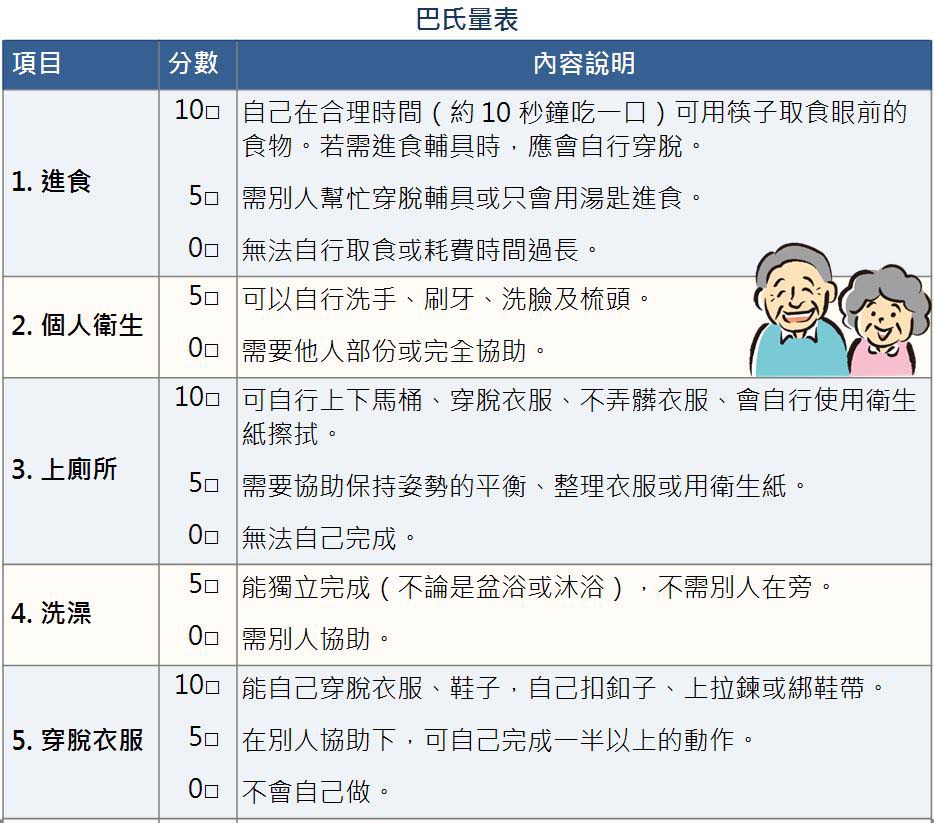 ◆ 失能判定工具一:日常生活活動功能評估ADLs (台灣常用的是巴氏量表)