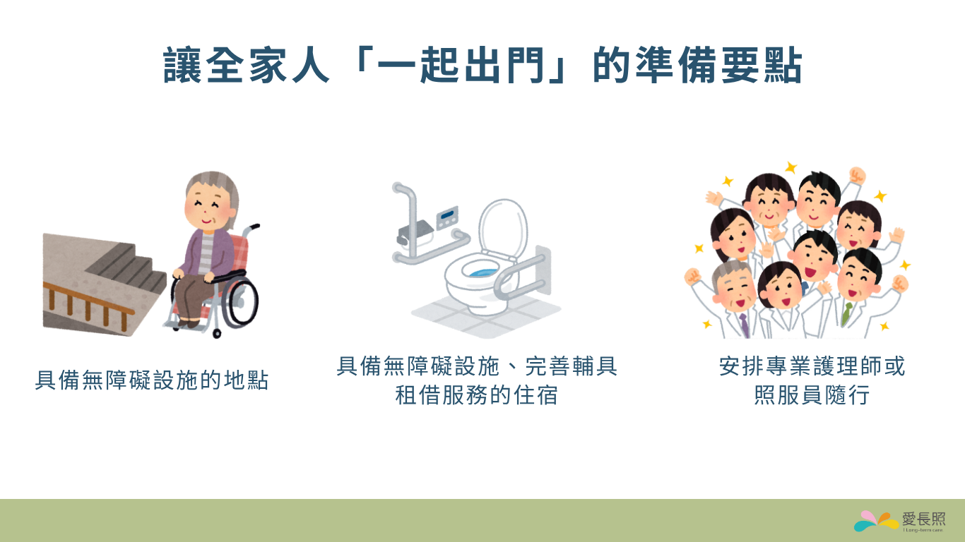 • 善用外部資源:可以尋求專門提供無障礙旅行之旅行社的協助,也可以提早與飯店、餐廳溝通家人的需求。