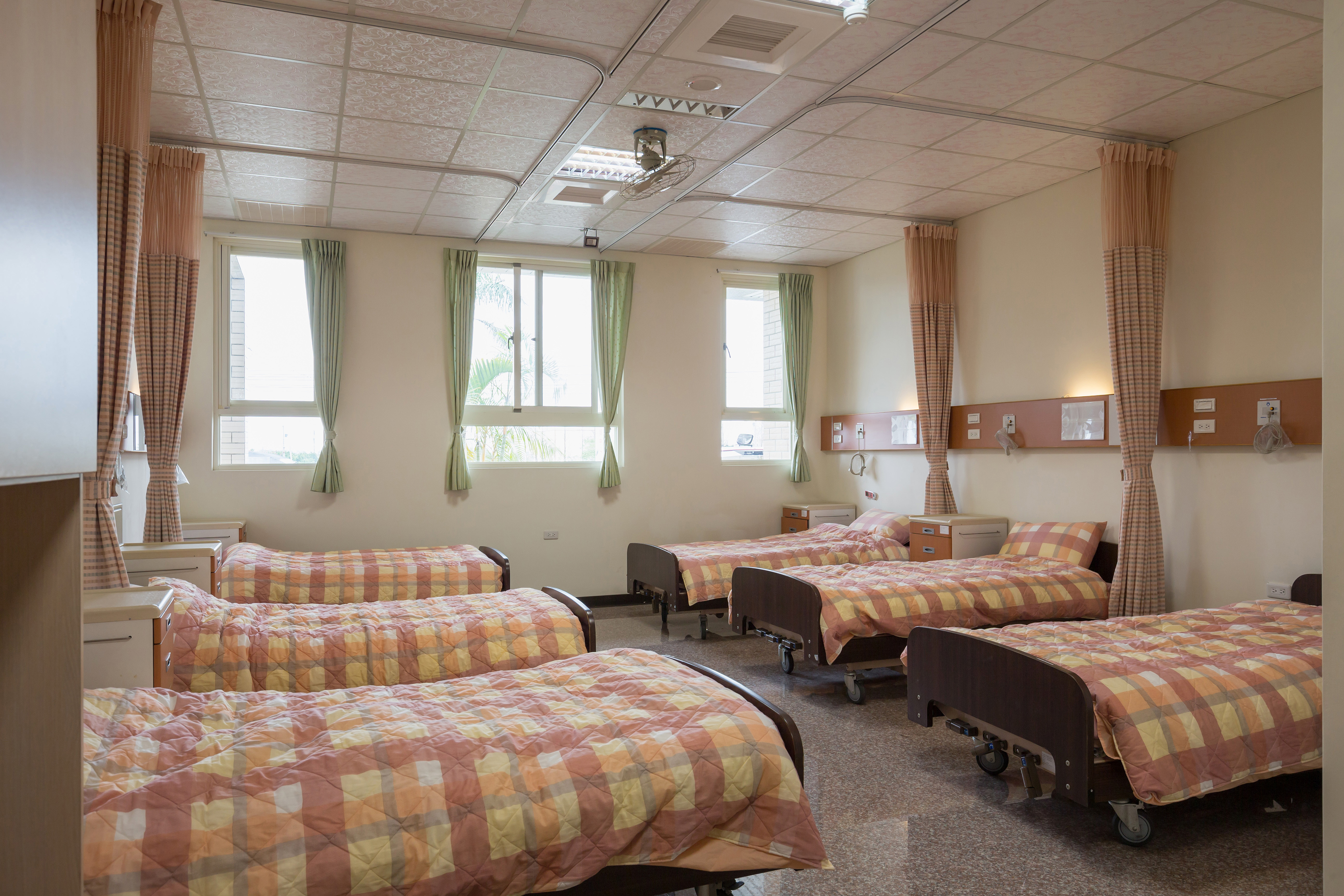 葳群提供三人房與六人房,讓長輩能依自身需求選擇合適的生活節奏。三人房安靜舒適,適合喜愛寧靜的長輩;六人房則多了相伴與交流,讓彼此的日子因互動而有溫度。地板特別選用了防跌倒設計,即使年紀漸長、步伐放慢,也能安心走動。