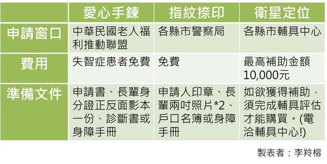 「GPS定位」產品有手錶、手機或追蹤器等不同形式,依廠牌不同,功能也有所不同,基本上除了有衛星定位功能之外,還可以主動追蹤協尋,有緊急救援的功能。目前市售的GPS定位產品價格偏高,所以建議您,可以多加利用身心障礙者輔具補助喔!最高可以補助10,000元呢!